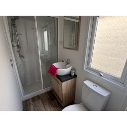 Le bungalow avec salle d'eau AS3 série standard correspond à un modèle standard équipé d'une pièce comprenant un lavabo, un WC, une douche et un vasistas entrebâillant.