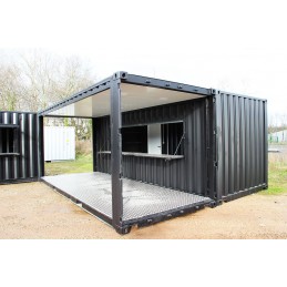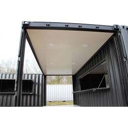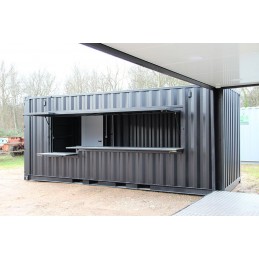 Container Shop for coffee or snacks, it is an adjustment of two two containers to form a shop. It has 6m in length and 3m in width for each.