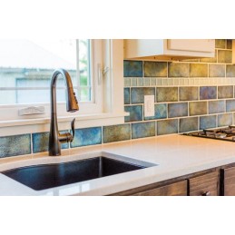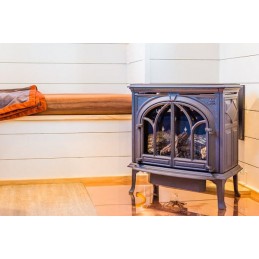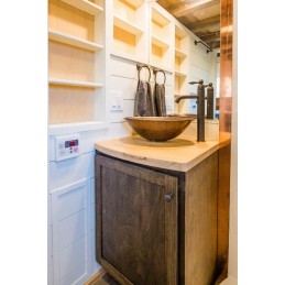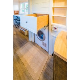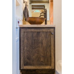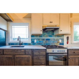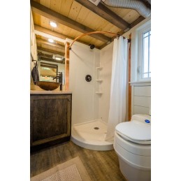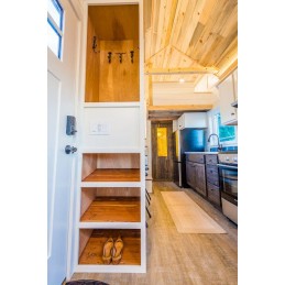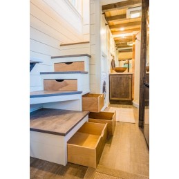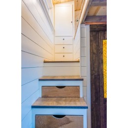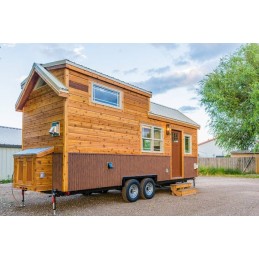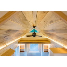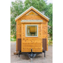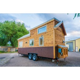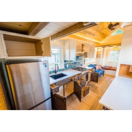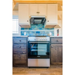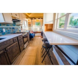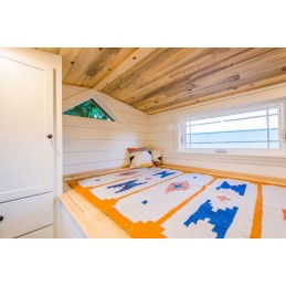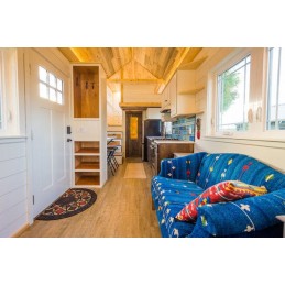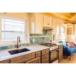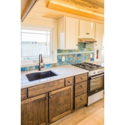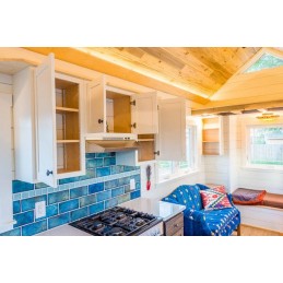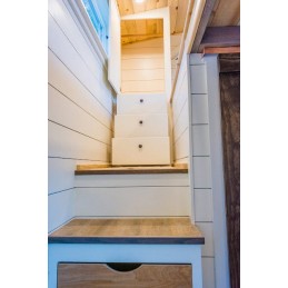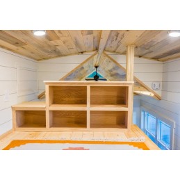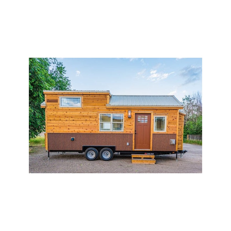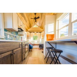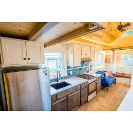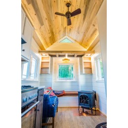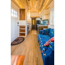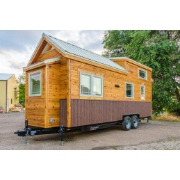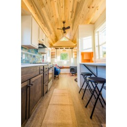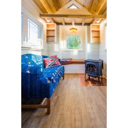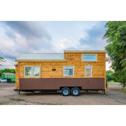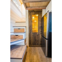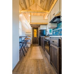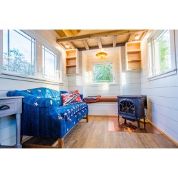 num reboque de 24 m2 de eixo duplo com um belo design rústico. O interior é acolhedor e funcional, com magníficas características de design, tais como um resguardo de cozinha em vidro e tectos em pinho cru!