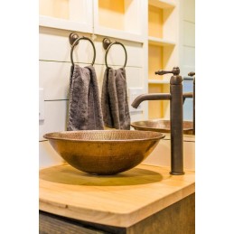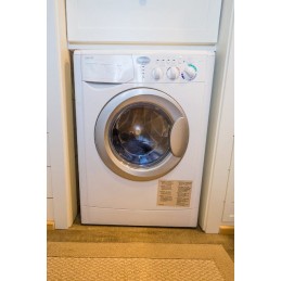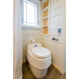 Casa de banho: chuveiro com corrimão de cobre, lavatório e toucador, sanita de compostagem Separett, combinação máquina de lavar/secar roupa