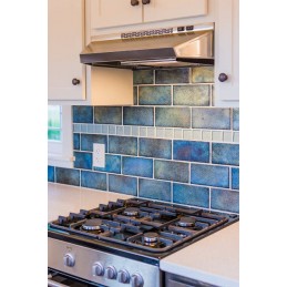 Cozinha: frigorífico em aço inoxidável, fogão de quatro bicos com exaustor, armários, painel de vidro.